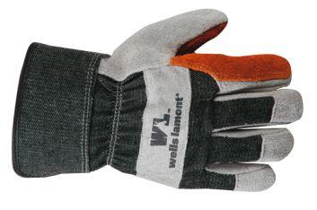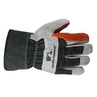 For really heavy duty protection and tough jobs, our double leather palm has a split cowhide leather palm with an extra reinforced split cowhide leather layer on the palm and first finger. Black denim back and safety cuff for easy on & off. Wing thumb for flexibility. Reinforced leather finger & thumb tips as well as leather knuckle strap for added protection. Especially good for barb wire, lumber handling, and concrete where abrasion is evident.