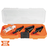The Premium Electrician's 3/8-Inch Hex Step Bit Set contains 3 step bits sized 7/8-Inch, 1-1/8-Inch, and 1-3/8-Inch for creating hole cutouts in panels and j-boxes to accommodate most commonly used 1/2-Inch, 3/4-Inch, and 1-Inch conduit. Dual straight flutes help pull the step bit through the material for clean cuts. The aluminum titanium nitride coating is 10 times more durable than steamed black oxide for longer bit life. The durable 3/8-Inch hex shank provides a firm, positive grip. The compact, modular case comes with cutting oil and is designed to nest neatly within MODbox™ toolboxes and on the MODbox™ Case Adapter Side Rail Attachment.