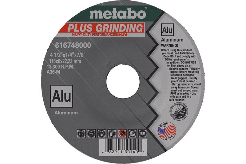 The Metabo Plus Grinding Wheel is designed for aluminum grinding applications, offering good stock removal and non-clogging capability. With a 4-1/2-inch diameter, 1/4-inch thickness, and 7/8-inch bore, it ensures efficient grinding performance on aluminum and other non-ferrous metals.