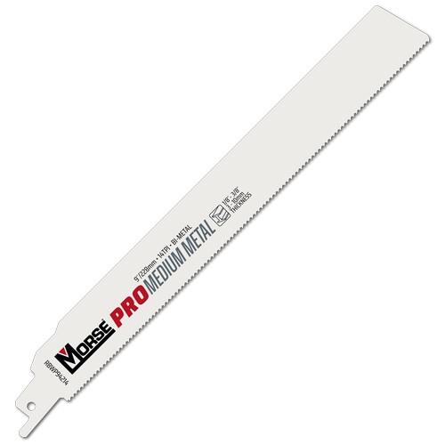Morse RBWP94214T05 (392082), 9" x 14TPI, bimetal reciprocating saw blade is designed for cutting metal, from 1/8", up to 3/8", thickness. Wider, thicker blade body reduces blade deflection, increases rigidity, under heavier feed pressure. Five (5) blades per pack.