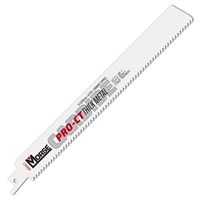 Morse CTR908MC15 (405799), 9" x 8TPI, carbide tipped reciprocating saw blade is designed for metal and hard, abrasive cutting applications that traditional blades can't cut. Precision ground tooth profile optimizes performance in metal applications of 3/8" and thicker, as well as abrasive applications between 3/16" and 1/2". Heavy duty blade body provides rigidity under heavier feed pressure. Fifteen (15) blades per pack.