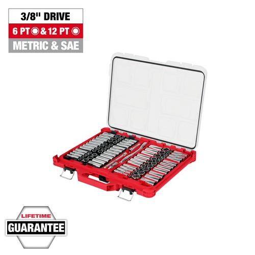 The MILWAUKEE® 98pc 3/8" Drive 6-Point and 12-Point Ratchet and Socket Set feature sockets with FOUR FLAT™ Sides that deter rolling and are wrench compatible for maximum productivity. The 90-tooth ratchet tool provides 4° of arc swing and a slim profile for work in tighter spaces. The laser-engraved size markings provide easy identification, and chrome plating offers rust and corrosion protection. The SAE & Metric 6-point and 12-point sockets come organized in a PACKOUT™ Low-Profile Organizer, which comes equipped with a clear top for easy identification of parts at a glance. This PACKOUT™ Organizer is IP65-rated and built from impact-resistant materials for durability on and off the job site with a reinforced hinge and heavy-duty latches. The Low-Profile Organizer is part of the MILWAUKEE® PACKOUT™ Modular Storage System, which is the most versatile and durable in the industry. A Limited Lifetime warranty covers the PACKOUT™ Low-Profile Organizer, while a Lifetime Guarantee backs the ratchets and sockets.