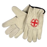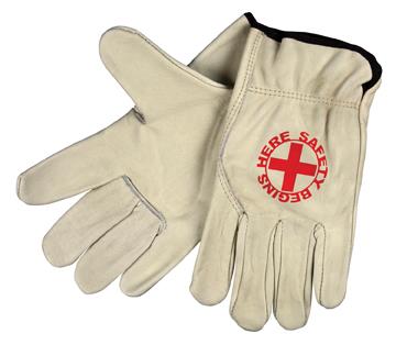 For More Information on the Drivers glove, Unlined Select Grain Cow Leather, Wing Thumb, Safety Begins Here logo. ,