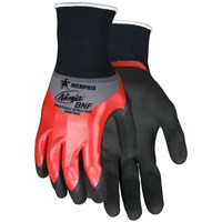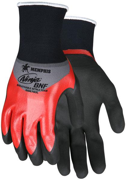 Memphis Ninja® gloves are engineered to provide the highest level of innovation. Ninja® BNF (Breathable Nitrile Foam) has exceptional abrasion resistance and unparalleled grip performance. This unique polymer achieves outstanding abrasion resistance based on ASTM and CE testing. Our BNF technology provides greater comfort and longer wear due to its excellent breathability by allowing the glove to better dissipate body heat. The N96783 features a lightweight 18-gauge Nylon/Spandex shell, 3/4 over the knuckle coating of red flat nitrile with a second coating on the palm and fingers of black BNF.