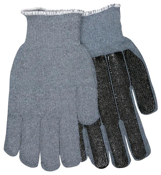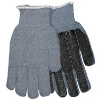 Most terry cloth is made with cotton because the absorbent fiber gets stronger when wet and it can be sanitized in very hot water using strong bleach and detergent without harm. Terry cloth also provides excellent thermal properties. Terry cloth is most often used for light heat applications in the industrial market. The 9408KM features 16 oz. gray regular weight cotton blend with a continuous knit wrist and black PVC strip palm coat. 9408KM is size small.