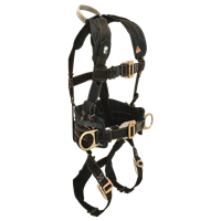 Features economical dorsal loop, leather insulated alloy steel hip D-rings and mating buckle leg, chest, belt and torso adjusters